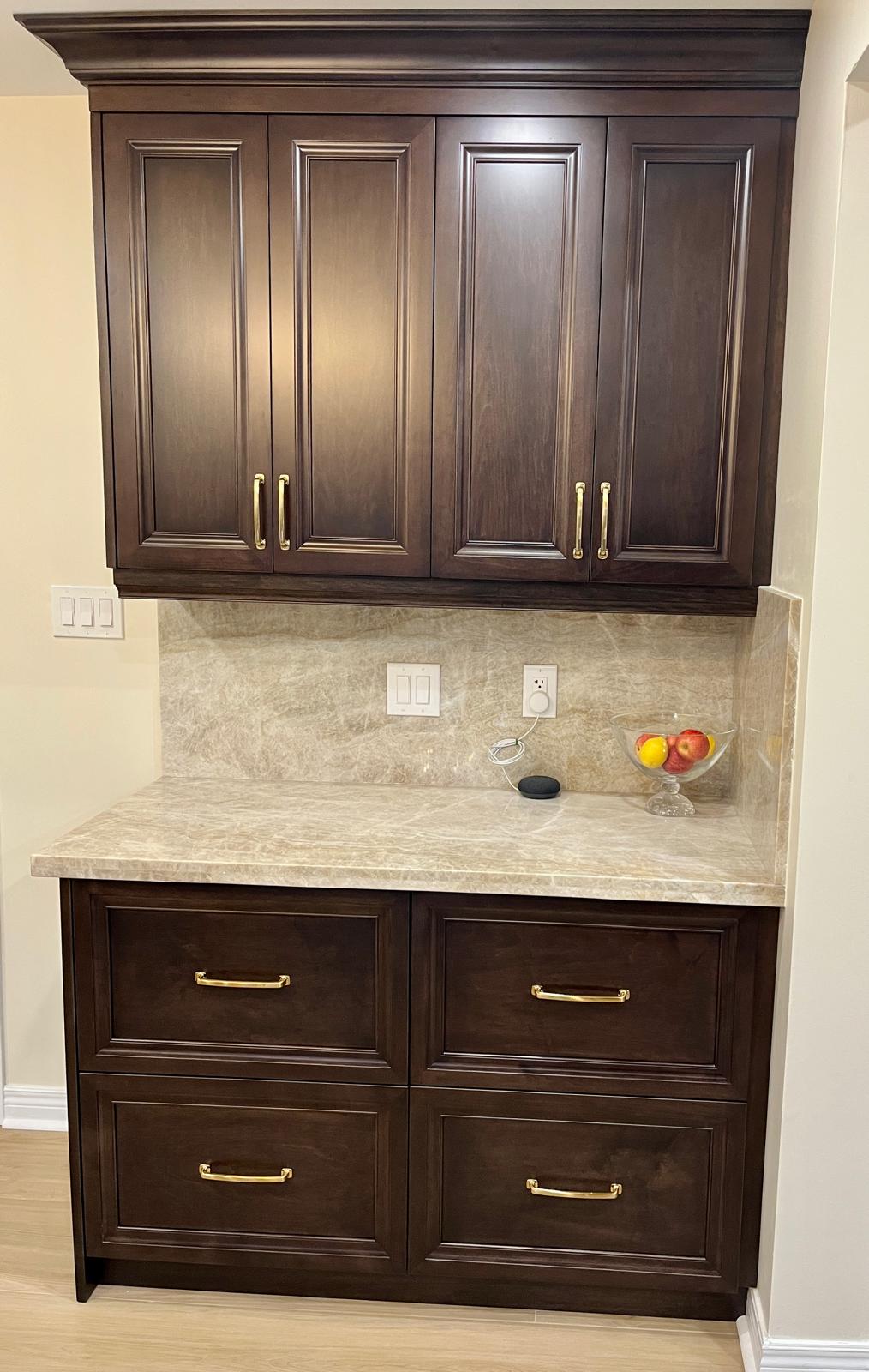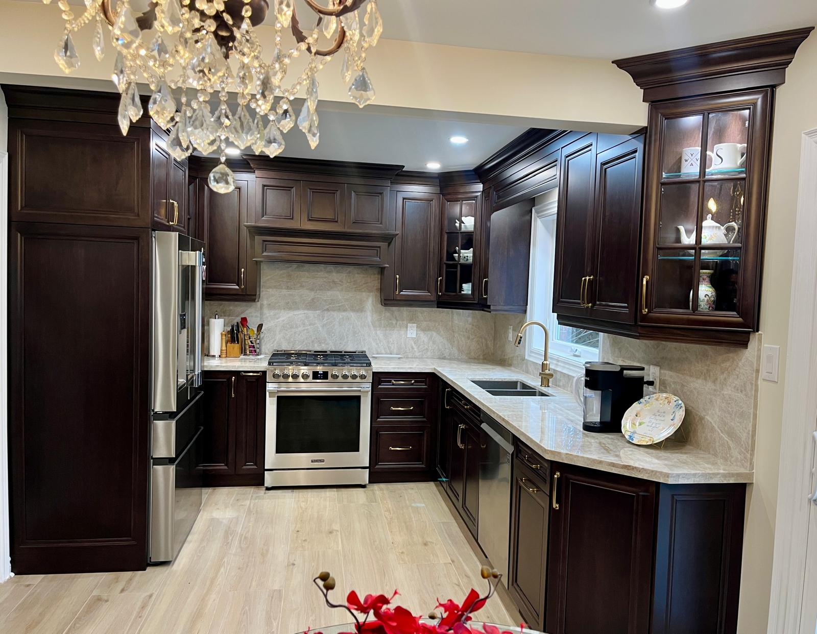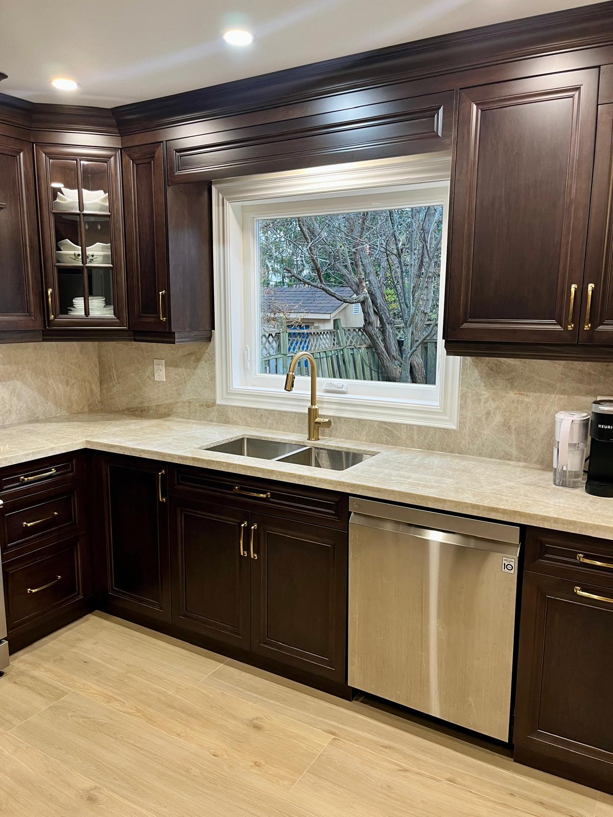 The newly renovated kitchen is a stunning showcase of modern design and premium finishes. Sleek maple cabinets line the walls, their smooth surfaces gleaming under the bright recessed pot lights. The rich, warm tones of the maple wood create an inviting atmosphere, while the streamlined cabinet design offers ample storage space without visual clutter. Topping the cabinets are expansive quartzite counters, their durability ensuring they’ll withstand years of meal preparation and family gatherings. The quartzite features an intricate patterning of soft grays and creams, adding depth and visual interest to the space. A coat of fresh paint in a light, airy hue adorns the walls and trim, brightening the entire room and providing a clean, crisp backdrop for the maple and quartzite finishes. Tying the space together are the wood grain tiles stretching across the floor, their textured surface providing the perfect balance of natural warmth and low-maintenance practicality. The interplay of sleek modern cabinets, elegant quartzite, fresh paint, and wood-look tiles creates a kitchen that is as functional as it is beautiful – a welcoming heart of the home ready for cooking, congregating, and creating cherished memories.